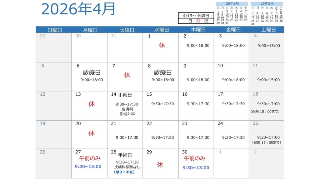 ※4月28日(火)は院長不在のため、美容施術、処置(光線・液体窒素)、薬のみの処方は可能